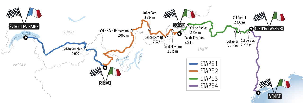Au départ d’ÉVIAN, la conquête des plus hauts cols d’Europe vous conduira à travers trois pays (France, Suisse, Italie). En quatre étapes vous découvrirez les plus belles routes de montagne chaque jour dont la Perle des Massifs Italiens : LES DOLOMITES.